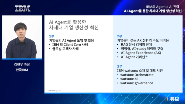 IBM 김현우 과장은 12월 2일 디지털데일리 웨비나 플랫폼 ‘DD튜브’를 통해 진행된 ‘IBM Agentic AI 전략 – AI Agent를 통한 차세대 기업 생산성 혁신’ 세션에서 이같이 말하며, “이미 많은 기업이 생성형 AI를 넘어 AI 에이전트 단계로 관심을 옮기고 있다”고 강조했다.